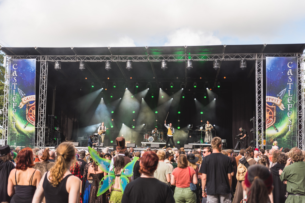 Een groot podium, geschikt voor festivals en evenementen met uitgebreide technische voorzieningen. Dit podium biedt voldoende ruimte voor bands, artiesten en producties met licht- en geluidsinstallaties.
